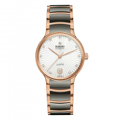 Il classico Rado Centrix Automatic Diamonds è stato rielaborato non solo tecnicamente, ma anche esteticamente. Il nuovo modello dispone di un cristallo zaffiro arrotondato che si estende fino al bordo e di una cassa ricurva che si integra con l’estremità del cristallo. Le anse della cassa ridisegnate e il bracciale in acciaio lucido rivestito in PVD color oro rosa con maglie centrali in ceramica hi-tech al plasma completano l’estetica rinnovata di questo iconico segnatempo. Il quadrante argento-bianco sfaccettato dispone di uno spettacolare effetto 3D realizzato tramite la stampa di un quadrante sagomato che viene poi riempito di lacca. All’interno, il calibro R763 a tre lancette supera gli standard di precisione nei test da 3 a 5 posizioni e grazie alla spirale antimagnetica Nivachron™ garantisce elevata affidabilità e puntualità. L’orologio è impermeabile fino a 50 m e offre una riserva di carica di 80 ore.
