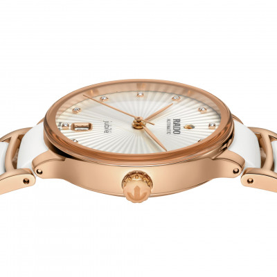 Il classico Rado Centrix Automatic Diamonds è stato rielaborato non solo tecnicamente, ma anche esteticamente. Il nuovo modello dispone di un cristallo zaffiro arrotondato che si estende fino al bordo e di una cassa ricurva che si integra con l’estremità del cristallo. Le anse della cassa ridisegnate e il bracciale in acciaio lucido rivestito in PVD color oro rosa con maglie centrali in ceramica hi-tech bianca completano l’estetica rinnovata di questo iconico segnatempo. Il quadrante sfaccettato color argento dispone di uno spettacolare effetto 3D realizzato tramite la stampa di un quadrante sagomato che viene poi riempito di lacca. All’interno, il calibro R763 a tre lancette supera gli standard di precisione nei test da 3 a 5 posizioni e grazie alla spirale antimagnetica Nivachron™ garantisce elevata affidabilità e puntualità. L’orologio è impermeabile fino a 50 m e offre una riserva di carica di 80 ore.