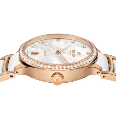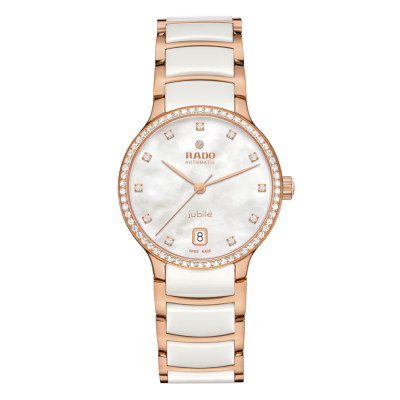 Scopri l'armoniosa fusione di espressione artistica e design raffinato con il Centrix Super Jubile. Realizzata in acciaio inossidabile e trattata con un rivestimento PVD color oro rosa, la cassa da 35 mm è coronata da una lunetta in acciaio inossidabile con rivestimento PVD color oro rosa incastonata con 60 diamanti taglio brillante Top Wesselton VS-SI e da un vetro zaffiro curvo con rivestimento antiriflesso su entrambi i lati, che garantisce una leggibilità impeccabile. Nel suo cuore, visibile dal fondello in vetro zaffiro, batte il calibro automatico R763 finemente regolato, regolato in cinque posizioni e dotato di spirale Nivachron™, che offre una precisione eccezionale e un'impressionante riserva di carica di 80 ore. Il quadrante in madreperla bianca, impreziosito da 11 indici con diamanti taglio brillante Top Wesselton VS-SI e da una finestrella della data a ore 6, irradia un'eleganza senza tempo. L'aspetto generale di questo iconico orologio è completato da anse della cassa elegantemente regolate e da un bracciale in acciaio inossidabile rivestito in PVD color oro rosa lucido con maglie centrali in ceramica high-tech bianca, fissato da una chiusura tripla pieghevole in acciaio inossidabile.