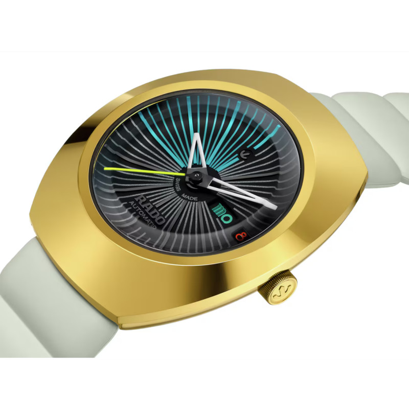Diastar Original, simbolo dell'artigianalità svizzera e dell'innovazione d'avanguardia, è rivisitato con audacia da b, designer industriale di fama mondiale. La cassa da 38 mm, sormontata da una lunetta Ceramos™ rivestita in PVD color oro giallo lucido, si integra perfettamente con la cassa centrale in acciaio inossidabile rivestita in PVD color oro giallo lucido, offrendo un'impermeabilità fino a 10 bar (100 metri). Il quadrante concavo nero opaco è una dimostrazione lampante della maestria di Rado nella cura dei dettagli tecnici, con minuterie stampate in argento e blu intersecate da indici applicati in rilievo a intervalli di cinque minuti. Alle ore 12 e 6, l'iconica ancora mobile color oro nero sabbiato e il logo Rado applicato si mostrano con orgoglio, completati da una finestrella per giorno e data alle ore 3, caratterizzata dal font esclusivo di Tej Chauhan in una tavolozza vivace e colorata che include vernice fluo. Le lancette delle ore e dei minuti color nero e oro lucido con Super-LumiNova® bianca e una lancetta dei secondi con accenti giallo fluo garantiscono una leggibilità impeccabile in qualsiasi condizione di luce. Il display ultra sofisticato è protetto da un cristallo zaffiro con sfaccettature radiali, impreziosito da un rivestimento interno antiriflesso. Ad alimentare questo modello è il calibro automatico R764. Regolato con precisione in cinque posizioni e dotato di spirale Nivachron™, questo movimento garantisce un elevato livello di precisione e una riserva di carica di 80 ore. A completare l'insieme, un cinturino in gomma grigia a cuscinetti è fissato da una fibbia pieghevole estensibile in acciaio inossidabile con rivestimento in PVD grigio scuro, sormontata da una copertura color oro giallo e pulsanti incisi con le iscrizioni Rado x TC.