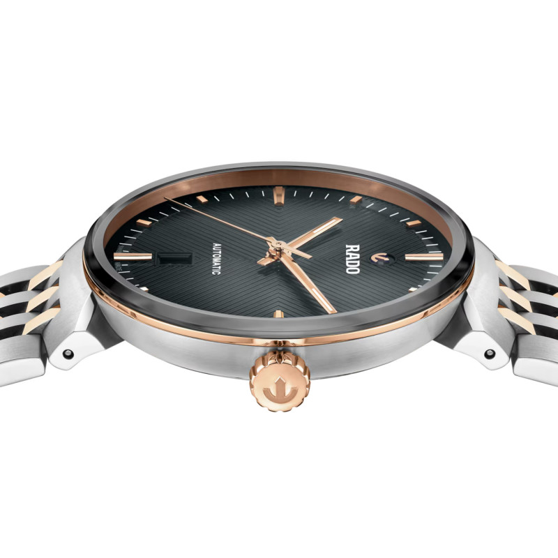 Scopri l'eleganza senza tempo e la precisione svizzera dell'iconico Rado Florence. La cassa da 39 mm è impreziosita da un cristallo zaffiro edge-to-edge, con un elegante bordo metallizzato color acciaio che richiama il quadrante. Questo cristallo zaffiro funge sia da parte anteriore protettiva sia da lunetta in PVD color oro rosa, integrandosi perfettamente nella cassa per esaltare l'iconico profilo raffinato di Florence. Il quadrante grigio, simile a una scenografia teatrale, evidenzia un'attenzione ai dettagli senza pari grazie al suo sofisticato motivo in rilievo. Gli indici delle ore color oro rosa, applicati con precisione e sormontati dal simbolo dell'ancora mobile Rado, sono rifiniti con spazzolatura e lucidatura, creando un contrasto ipnotizzante sullo sfondo grigio. La cassa è abbinata a un bracciale in acciaio inossidabile con rivestimento PVD color oro rosa lucido, caratterizzato da maglie spazzolate e lucidate, e dotato di una chiusura in acciaio inossidabile a fibbia a tripla piega. Sotto il fondello in cristallo zaffiro sagomato si cela l'essenza del Florence: il calibro automatico R763. Finemente regolato in cinque posizioni e dotato di spirale Nivachron™, questo movimento assicura un'eccellente precisione e una robusta riserva di carica di 80 ore, evidenziando l'impegno di Rado per la perfezione.