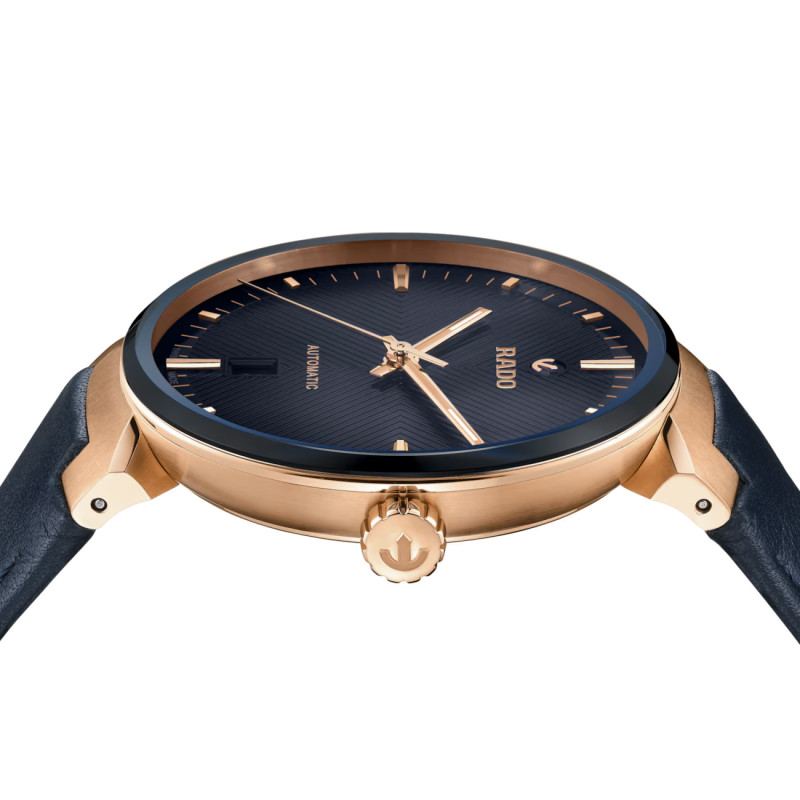 Scopri l'eleganza senza tempo e la precisione svizzera dell'iconico Rado Florence. La cassa da 39 mm è impreziosita da un cristallo zaffiro edge-to-edge, con un elegante bordo metallizzato blu che richiama il quadrante. Questo cristallo zaffiro funge sia da parte anteriore protettiva sia da lunetta, integrandosi perfettamente nella cassa per esaltare l'iconico profilo raffinato di Florence. Il quadrante blu, simile a una scenografia teatrale, evidenzia un'attenzione ai dettagli senza pari grazie al suo sofisticato motivo in rilievo. Gli indici delle ore color oro rosa, applicati con precisione e sormontati dal simbolo dell'ancora mobile Rado, sono rifiniti con spazzolatura e lucidatura, creando un contrasto ipnotizzante sullo sfondo blu. La cassa è completata da un cinturino in pelle blu, perfettamente proporzionato alle maglie. La cassa è abbinata a un bracciale in acciaio inossidabile con rivestimento PVD color oro rosa, caratterizzato da maglie spazzolate e lucidate, e dotato di una chiusura in acciaio inossidabile a fibbia a tripla piega. Sotto il fondello in cristallo zaffiro sagomato si cela l'essenza del Florence: il calibro automatico R763. Finemente regolato in cinque posizioni e dotato di spirale Nivachron™, questo movimento assicura un'eccellente precisione e una robusta riserva di carica di 80 ore, evidenziando l'impegno di Rado per la perfezione.