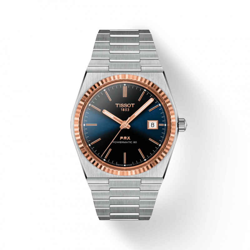 Nel 1978, Tissot ha creato un modello al quarzo con cassa sottile, indici stretti e bracciale in acciaio. La sua ampia ansa orizzontale, tipica dell'epoca, era perfettamente integrata nella cassa piatta a forma di tonneau. Pochi anni dopo, Tissot registrò il nome PRX. "PR" sta per "preciso" e "robusto". La "X" sta per il numero romano dieci e per la pressione di 10 bar, che corrisponde ad una profondità di 100 metri, fino alla quale l'orologio è impermeabile. Nel 2021 Tissot lancia il nuovo PRX come moderna interpretazione del modello precedente. La cassa in acciaio inossidabile 316L del Tissot PRX ha un diametro di 40 mm. Ha una forma leggermente tonneau con una lunetta stretta e rotonda. Ai lati, finiture spazzolate verticalmente, arrotondate si alternano a sfaccettature lucide. Il Tissot PRX Powermatic 80 acciaio e oro 18 carati è dotato di una ghiera in oro rosa 18 carati che, insieme agli indici e alle lancette dello stesso colore, creano un piacevole contrasto con il quadrante blu. Le lancette del Tissot PRX Powermatic 80 acciaio e oro 18 carati sono dotate di un rivestimento SuperLumiNova® e sono posizionate una sopra l'altra con uno spazio molto piccolo. Ciò consente di avvicinare il quadrante al vetro dell'orologio. L'effetto ottico ottenuto dai designer Tissot fa apparire la cassa dell'orologio ancora più piatta e sottile di quanto non sia in realtà. Il Tissot PRX Powermatic 80 acciaio e oro 18 carati ha un vetro zaffiro antigraffio con rivestimento antiriflesso su entrambi i lati e un fondello in vetro minerale. Il tuo movimento automatico Swiss Made con una riserva di carica fino a 80 ore è dotato di una molla a spirale Nivachron, nota per l'eccellente sicurezza del campo magnetico. L'orologio ha un bracciale in acciaio inossidabile 316L.