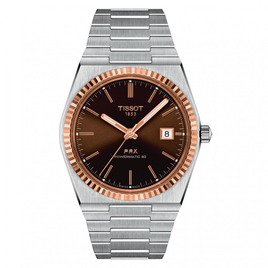 Nel 1978, Tissot ha creato un modello al quarzo con cassa sottile, indici stretti e bracciale in acciaio. La sua ampia ansa orizzontale, tipica dell'epoca, era perfettamente integrata nella cassa piatta a forma di tonneau. Pochi anni dopo, Tissot registrò il nome PRX. "PR" sta per "preciso" e "robusto". La "X" sta per il numero romano dieci e per la pressione di 10 bar, che corrisponde ad una profondità di 100 metri, fino alla quale l'orologio è impermeabile. Nel 2021 Tissot lancia il nuovo PRX come moderna interpretazione del modello precedente. La cassa in acciaio inossidabile 316L del Tissot PRX ha un diametro di 40 mm. Ha una forma leggermente tonneau con una lunetta stretta e rotonda. Ai lati, finiture spazzolate verticalmente, arrotondate si alternano a sfaccettature lucide. Il Tissot PRX Powermatic 80 acciaio e oro 18 carati è dotato di una ghiera in oro rosa 18 carati che, insieme agli indici e alle lancette dello stesso colore, creano un piacevole contrasto con il quadrante marrone. Le lancette del Tissot PRX Powermatic 80 acciaio e oro 18 carati sono dotate di un rivestimento SuperLumiNova® e sono posizionate una sopra l'altra con uno spazio molto piccolo. Ciò consente di avvicinare il quadrante al vetro dell'orologio. L'effetto ottico ottenuto dai designer Tissot fa apparire la cassa dell'orologio ancora più piatta e sottile di quanto non sia in realtà. Il Tissot PRX Powermatic 80 acciaio e oro 18 carati ha un vetro zaffiro antigraffio con rivestimento antiriflesso su entrambi i lati e un fondello in vetro minerale. Il tuo movimento automatico Swiss Made con una riserva di carica fino a 80 ore è dotato di una molla a spirale Nivachron, nota per l'eccellente sicurezza del campo magnetico. L'orologio ha un bracciale in acciaio inossidabile 316L.
