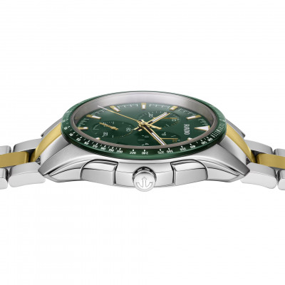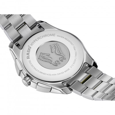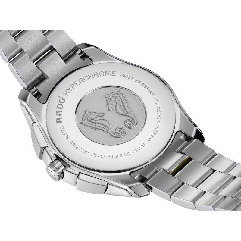 Questo HyperChrome Chronograph da 45 mm con movimento al quarzo Rado R312 è dotato di un quadrante verde che si abbina perfettamente al bracciale a 3 file di maglie in acciaio lucido con maglie centrali spazzolate di colore giallo. Le sfere e e gli indici di colore giallo con Super-LumiNova® bianca garantiscono una perfetta visibilità. La cassa è realizzata in acciaio lucido e satinato, mentre la lunetta con tachimetro inciso è in ceramica hi-tech verde lucida. L'orologio è impermeabile fino a 100 m.