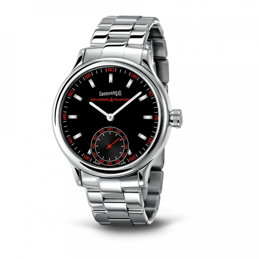 Scala dei minuti rossa. Scala dei piccoli secondi e lancetta dei piccoli secondi in rosso. Quadrante nero con indici appliques.