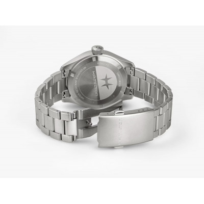 Il Khaki Field Mechanical Power Reserve 40 mm rende omaggio al design tradizionale e alla funzionalità essenziale della famiglia Khaki, introducendo al contempo caratteristiche moderne e le ultime novità in fatto di tecnologia e innovazione orologiere. Dotato di un nuovo movimento a carica manuale H-23, sviluppato da ETA in esclusiva per Hamilton, consente per la prima volta di visualizzare direttamente sul quadrante la riserva di carica di 80 ore. Dotato di un bracciale in acciaio, il quadrante nero mostra le diciture “power reserve 80 hours” (“riserva di carica di 80 ore”), “F” (completamente carico) ed “E” (scarico), sottolineando questa caratteristica funzionale d’eccezione.