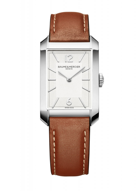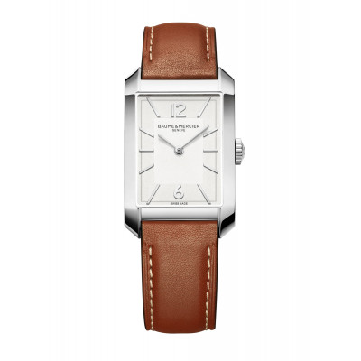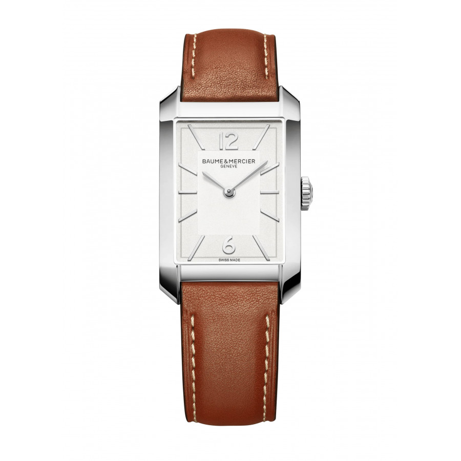 Questo Baume & Mercier Hampton automatico fonde stile urbano ed eccellenza orologiera. Il suo quadrante è bianco opalino ed è sottolineato da una minuteria grigia. L’elegante cassa rettangolare in acciaio è abbinata a un cinturino intercambiabile in pelle di vitello marrone chiaro con impunture beige.