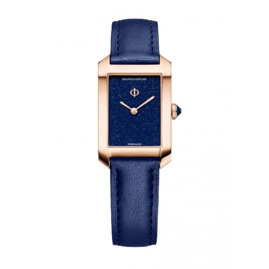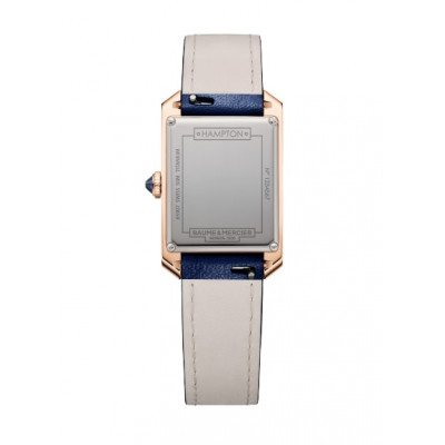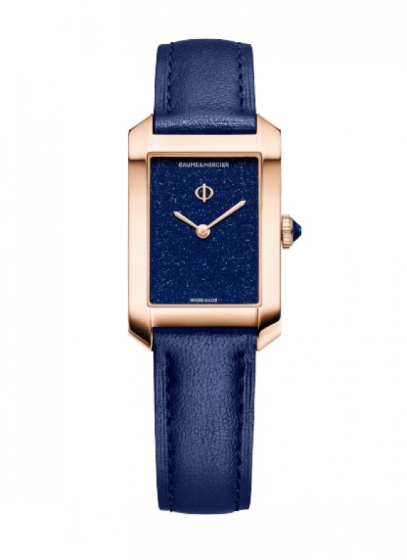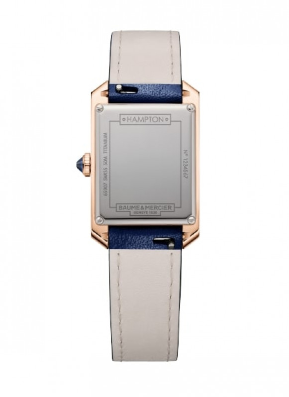Degni eredi di questa vocazione, i due nuovi Hampton (10673 & 10674) si presentano con una cassa affusolata dalle proporzioni equilibrate (35 x 22,2 cm e 6,9 mm di spessore), realizzata in due versioni: una in acciaio inossidabile lucido e l’altra in oro rosa 18 carati (750/1000) e titanio lucido. Protetta da un vetro zaffiro bombato antigraffio, la cassa accoglie un movimento al quarzo di nuova generazione che indica ore e minuti, ed è dotato di un’autonomia di otto anni. I modelli rivelano inoltre un armonioso abbinamento di colori e materiali: per la cassa in acciaio è stato studiato un quadrante bordeaux, mentre per quella in oro un quadrante blu. Entrambi sono impreziositi da un rivestimento delicatamente paillettato che, ispirandosi alle pietre di avventurina e rubino stellato, crea un effetto scintillante in grado di esaltare la femminilità di questi raffinati segnatempo. La finitura del quadrante sublima la luce che attraversa la lunetta, ravvivandola e dandole rilievo. La ricerca di un design essenziale, firma dei modelli Baume & Mercier, si traduce nella presenza di due lancette a gladio e dell’elegante simbolo Phi, logo della Maison, applicato a ore 12.