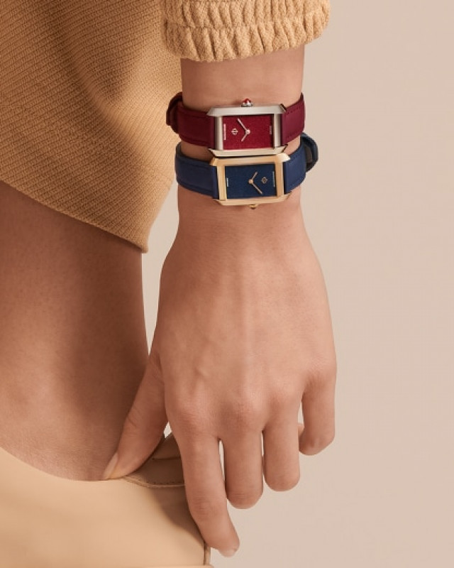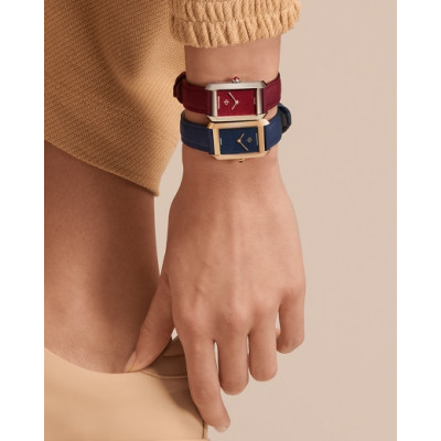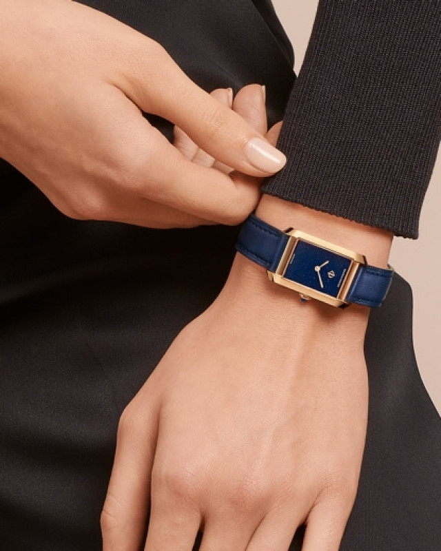 L'Hampton 10674 gioca su una combinazione armoniosa di colori e materiali. Questo orologio rettangolare in oro rosa 18 carati presenta un quadrante blu scintillante abbinato a un cinturino in pelle di vitello blu per un tocco di eleganza monocromatica.