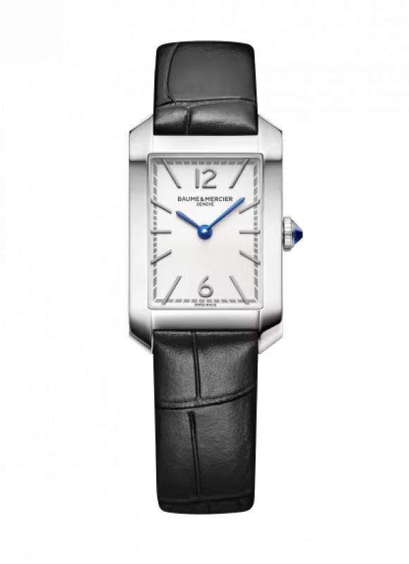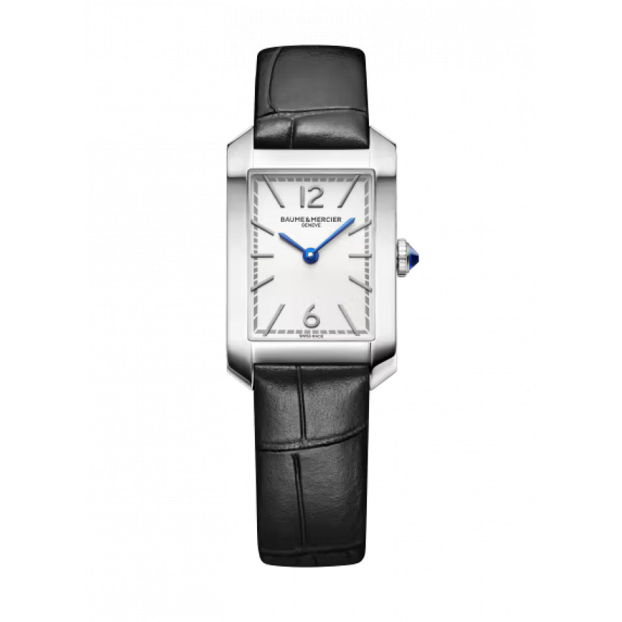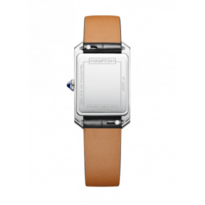L'Hampton 10795 è ornato da un quadrante opalino bianco-argenteo con numeri arabi e indici rodiati rivettati e lancette a forma di spada blu. La cassa rettangolare in acciaio inossidabile lucidato è dotata di una corona in acciaio a forma di cabochon e di uno spinello sintetico blu incastonato. Il cinturino intercambiabile in pelle nera con motivo alligatore è dotato di un affidabile sistema di sostituzione senza attrezzi.