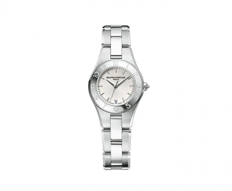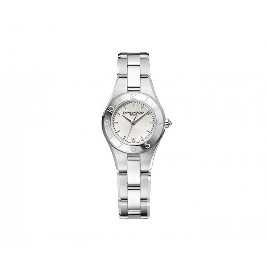 Orologio in acciaio della collezione Linea di Baume & Mercier, con anche un cinturino in pelle nero annesso.