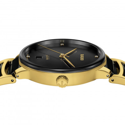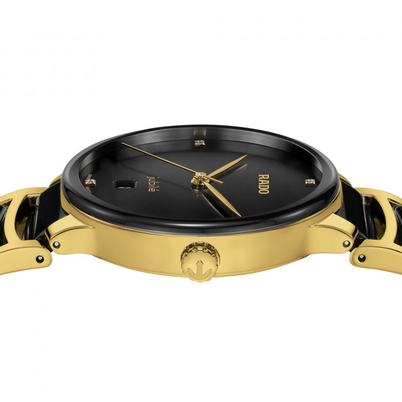 Il classico Rado Centrix Quartz Diamonds è stato rielaborato non solo tecnicamente, ma anche esteticamente. Il nuovo modello dispone di un cristallo zaffiro arrotondato che si estende fino al bordo e di una cassa ricurva che si integra con l’estremità del cristallo. L’estetica rinnovata di questo iconico segnatempo è ultimata dalle anse della cassa ridisegnate e dal bracciale in acciaio rivestito in PVD color oro giallo lucido con maglie centrali in ceramica high-tech nera. Il quadrante nero laccato, impreziosito da 4 brillanti e sottolineato dal logo “jubilé” stampato, si abbina alla perfezione alle lancette color oro giallo. Grazie al movimento al quarzo calibro R073 dotato di PreciDrive e HeavyDrive, il segnatempo è dotato di grande precisione e resistenza agli urti. L'orologio è impermeabile fino a 50 m.