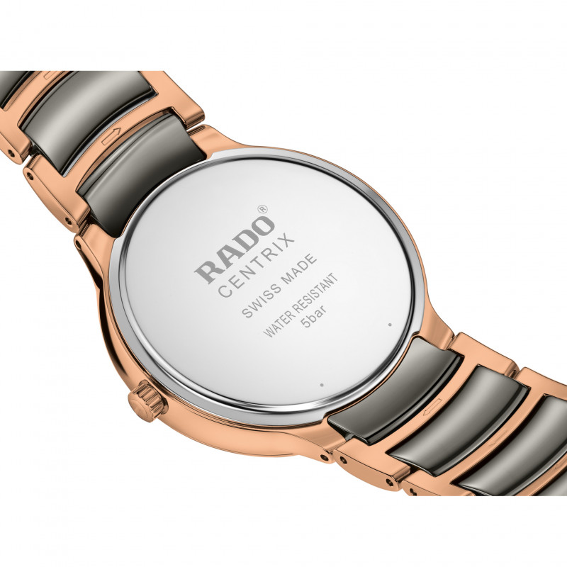 Il classico Rado Centrix Quartz è stato rielaborato non solo tecnicamente, ma anche esteticamente. Il nuovo modello dispone di un cristallo zaffiro arrotondato che si estende fino al bordo e di una cassa ricurva che si integra con l’estremità del cristallo. L’estetica rinnovata di questo iconico segnatempo è ultimata dalle anse della cassa ridisegnate e dal bracciale in acciaio rivestito in PVD color oro rosa lucido con maglie centrali in ceramica high-tech plasma. Il quadrante soleil color argento, con indici applicati color oro rosa, si abbina perfettamente alle lancette color oro rosa. Grazie al movimento al quarzo calibro R073 dotato di PreciDrive e HeavyDrive, il segnatempo è dotato di grande precisione e resistenza agli urti. L'orologio è impermeabile fino a 50 m.