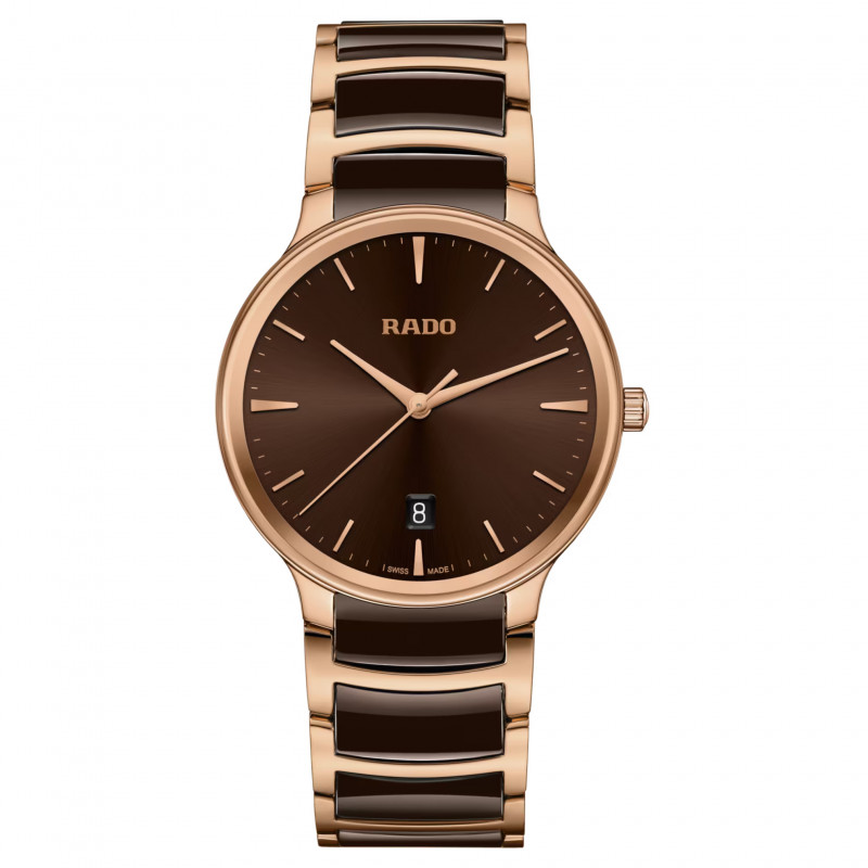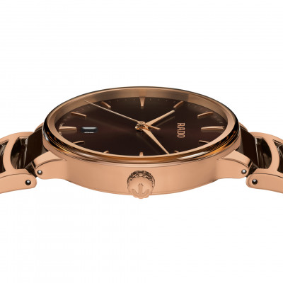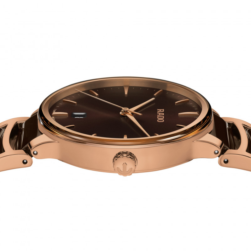 Il classico Rado Centrix Quartz è stato rielaborato non solo tecnicamente, ma anche esteticamente. Il nuovo modello dispone di un cristallo zaffiro arrotondato che si estende fino al bordo e di una cassa ricurva che si integra con l’estremità del cristallo. L’estetica rinnovata di questo iconico segnatempo è ultimata dalle anse della cassa ridisegnate e dal bracciale in acciaio rivestito in PVD color oro rosa lucido con maglie centrali in ceramica high-tech marrone. Il quadrante marrone soleil, con indici applicati color oro rosa, si abbina perfettamente alle lancette color oro rosa. Grazie al movimento al quarzo calibro R073 dotato di PreciDrive e HeavyDrive, il segnatempo è dotato di grande precisione e resistenza agli urti. L'orologio è impermeabile fino a 50 m.