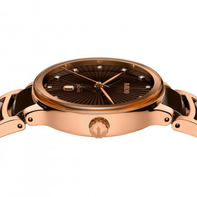 Il classico Rado Centrix Quartz Diamonds è stato rielaborato non solo tecnicamente, ma anche esteticamente. Il nuovo modello dispone di un cristallo zaffiro arrotondato che si estende fino al bordo e di una cassa ricurva che si integra con l’estremità del cristallo. L’estetica rinnovata di questo iconico segnatempo è ultimata dalle anse della cassa ridisegnate e dal bracciale in acciaio rivestito in PVD color oro rosa lucido con maglie centrali in ceramica high-tech marrone. Grazie al movimento al quarzo calibro R079 dotato di PreciDrive e HeavyDrive, il segnatempo è dotato di grande precisione e resistenza agli urti. L'orologio è impermeabile fino a 50 m.
