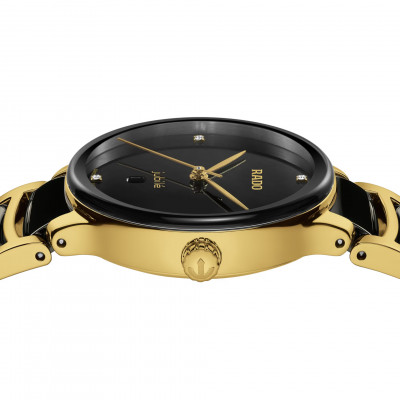 Il classico Rado Centrix Quartz Diamonds è stato rielaborato non solo tecnicamente, ma anche esteticamente. Il nuovo modello dispone di un cristallo zaffiro arrotondato che si estende fino al bordo e di una cassa ricurva che si integra con l’estremità del cristallo. L’estetica rinnovata di questo iconico segnatempo è ultimata dalle anse della cassa ridisegnate e dal bracciale in acciaio rivestito in PVD color oro giallo lucido con maglie centrali in ceramica high-tech nera. Il quadrante nero laccato, impreziosito da 4 brillanti e sottolineato dal logo “jubilé” stampato, si abbina alla perfezione alle lancette color oro giallo. Grazie al movimento al quarzo calibro R079 dotato di PreciDrive e HeavyDrive, il segnatempo è dotato di grande precisione e resistenza agli urti. L'orologio è impermeabile fino a 50 m.