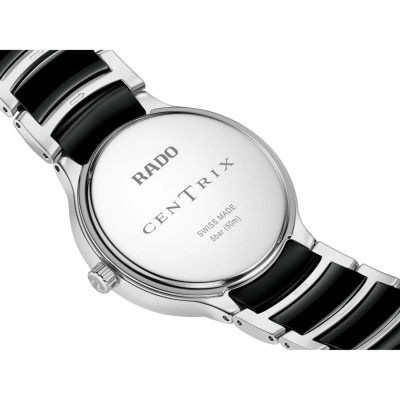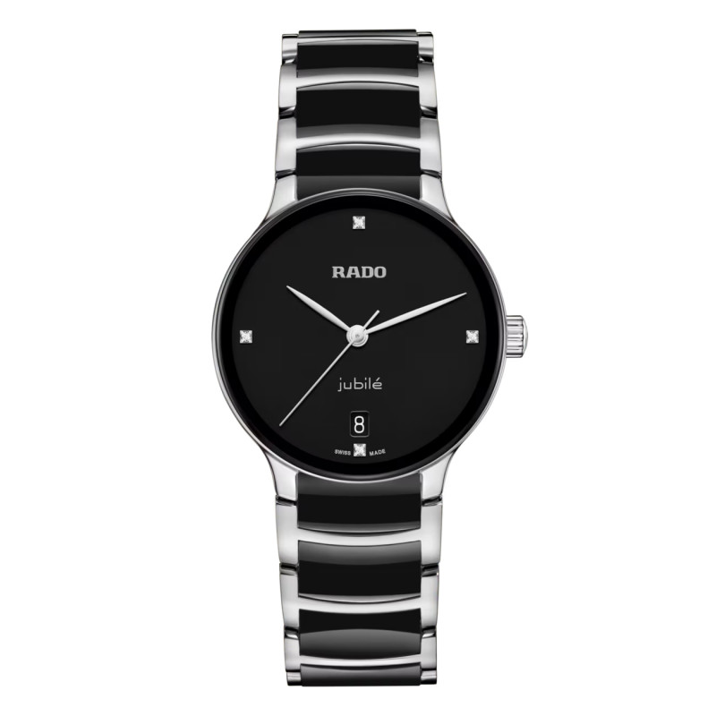 Il classico Rado Centrix Quartz Diamonds è stato rielaborato non solo tecnicamente, ma anche esteticamente. Il nuovo modello dispone di un cristallo zaffiro arrotondato che si estende fino al bordo e di una cassa ricurva che si integra con l’estremità del cristallo. Le anse della cassa ridisegnate e il bracciale in acciaio lucido con maglie centrali in ceramica high-tech nera completano l’estetica rinnovata di questo iconico segnatempo. Il quadrante nero laccato, impreziosito da 4 brillanti e sottolineato dal logo “jubilé” stampato, si abbina perfettamente alle lancette color rodio. Grazie al movimento al quarzo calibro R073 dotato di PreciDrive e HeavyDrive, il segnatempo è dotato di grande precisione e resistenza agli urti. L'orologio è impermeabile fino a 50 m.