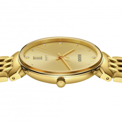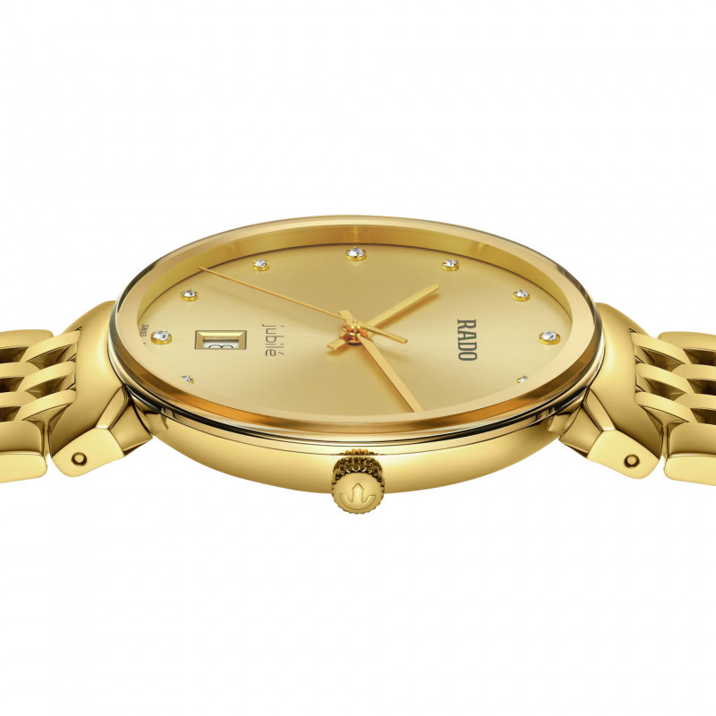 Il design armonioso del Rado Florence richiama le eleganti cupole e le torri della città da cui la collezione prende il nome. Azionato dall’affidabile movimento al quarzo Rado calibro R073 a tre lancette, questo segnatempo garantisce estrema precisione e resistenza agli urti. L'orologio, del diametro di 38 mm, dispone di un cristallo zaffiro ricurvo arrotondato edge-to-edge. Il modello è dotato di cassa, corona, lunetta e fondello in acciaio con rivestimento PVD color oro giallo lucido. Un bracciale in acciaio rivestito in oro giallo lucido completa l'estetica di questo classico segnatempo. Il quadrante in oro giallo con 12 diamanti, sottolineato dal logo "jubilé" stampato, si abbina perfettamente alle lancette color oro giallo. L'orologio è impermeabile fino a 50 m ed è disponibile anche nella taglia S, il che lo rende un esemplare ideale per le coppie.