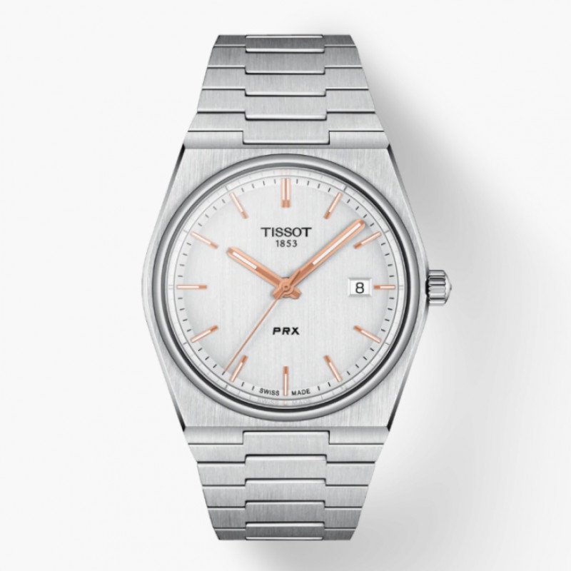 Nel 1978 Tissot creò un modello al quarzo, caratterizzato da una cassa sottile, indici stretti e un bracciale in acciaio. La sua ampia ansa orizzontale, tipica dell'epoca, era perfettamente integrata nella cassa piatta a forma di tonneau. Pochi anni dopo, Tissot ha registrato il nome PRX. "PR" sta per "preciso" e "robusto". La "X" sta per il numero romano dieci e per la pressione di 10 bar che l'orologio è in grado di sopportare. Nel 2021 Tissot ha presentato il PRX 40205, È una versione moderna del modello precedente. La cassa in acciaio inossidabile 316L del Tissot PRX 40205 ha un diametro di 40 mm. Ha una forma leggermente tonneau ed è ornato da una lunetta stretta e rotonda. Ai lati, spazzolate verticalmente, finiture arrotondate si alternano a sfaccettature lucide. Il Tissot PRX 40205 Quartz è dotato di un quadrante con un motivo a raggiera nero o blu in combinazione con indici e lancette nichelati. Esiste anche una variante con quadrante grigio argento satinato con indici e lancette color oro rosa, una combinazione di colori che ricorda la fine degli anni '70. La flessibilità e morbidezza delle maglie ne fanno un vero successo di design ergonomico e trasmettono uno straordinario comfort. Le lancette del PRX 40 205 sono dotate di un rivestimento SuperLumiNova® e sono posizionate l'una sull'altra con uno spazio minimo. Ciò consente di avvicinare il quadrante al vetro dell'orologio. L'effetto ottico ottenuto dai designer Tissot fa sembrare la cassa dell'orologio ancora più piatta e sottile di quanto non sia in realtà.