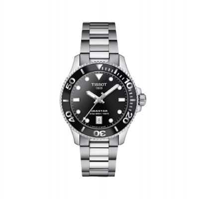 L'orologio Tissot Seastar 1000 Quartz 36mm è perfetto da indossare in immersione o nella vita di tutti i giorni. L’orologio da donna è super resistente e si presenta con lunette girevoli unidirezionali proprio per garantire l'impermeabilità fino a 30 bar (300 metri/1000 piedi). La Cassa 36 mm è in acciaio inossidabile 316L con vetro zaffiro antigraffio e antiriflesso. Il quadrante nero e il bracciale in acciaio inossidabile è intercambiabile a sgancio rapido munita di chiusura déployante con sicura e pulsanti.
