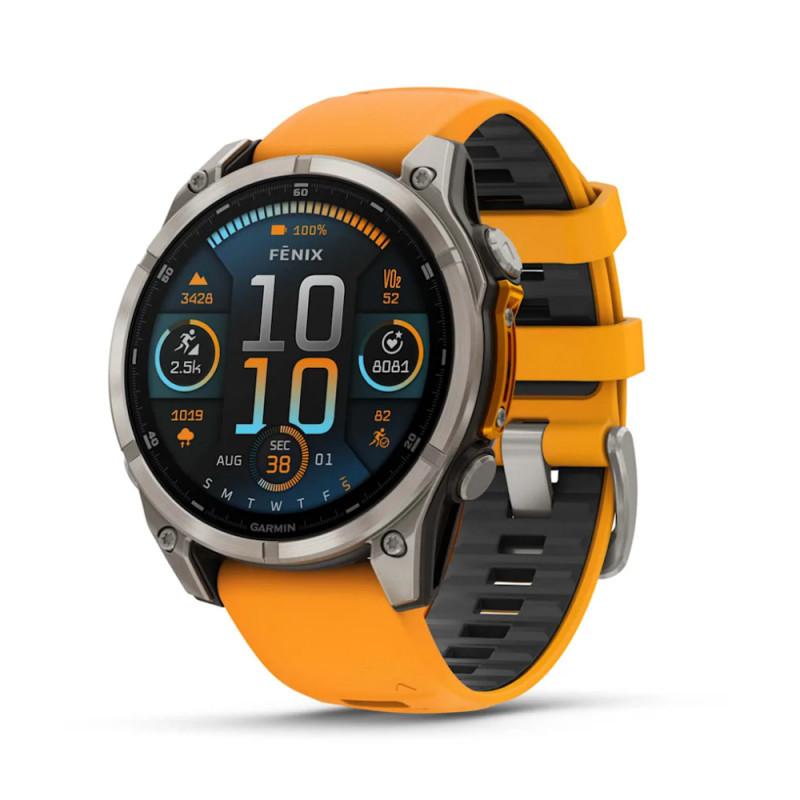Smartwatch Garmin Amoled Sapphire, Titanium con cinturino in silicone Spark Orange/grafite, della collezione Outdoor linea fēnix® 8.