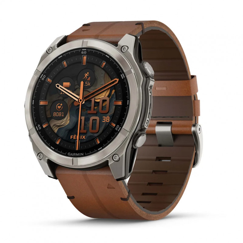 Smartwatch Garmin Amoled Sapphire, Titanium con cinturino in pelle Chestnut, della collezione Outdoor linea fēnix® 8.